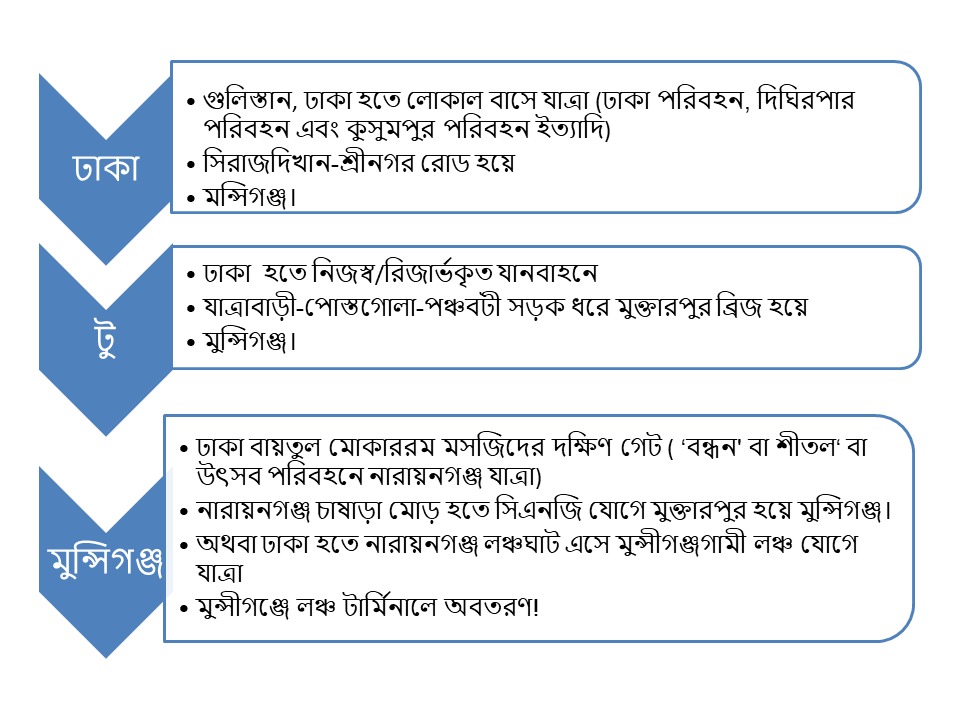 ন্সীগঞ্জ জেলা ঢাকা থেকে মাত্র ২6 কিলোমিটার দূরে। ঢাকায় গুলিস্তান থেকে মুন্সীগঞ্জের উদ্দেশ্যে ছেড়ে যাওয়া কয়েকটি কোম্পানির মিনিবাস রয়েছে। সিরাজদিখান-শ্রীনগর উপজেলা রাস্তাটির মাধ্যমে মুন্সিগঞ্জ সদর উপজেলায় পৌঁছা যায়। ঢাকা থেকে মুন্সীগঞ্জ সদর উপজেলাগামী কিছু বাস রয়েছে যা মানানীয় রাষ্ট্রপতির বাসভবনের দক্ষিণ গেইট থেকে ছাড়ে, যেমন ঢাকা পরিবহন, দিঘিরপার পরিবহন এবং কুসুমপুর পরিবহন ইত্যাদি।